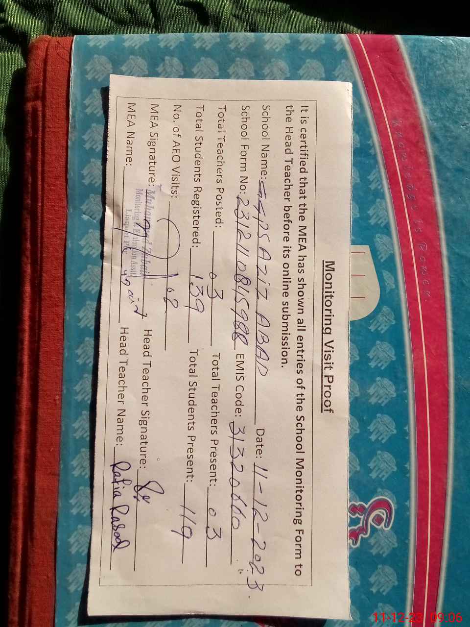| Attendance Register | Head Teacher | MEA with School | Visit Proof |