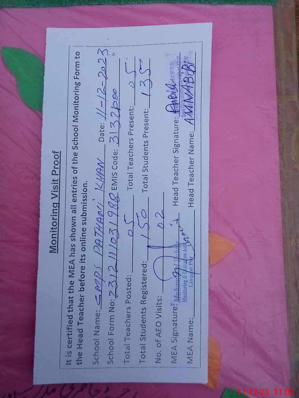 | Attendance Register | Head Teacher | MEA with School | Visit Proof |