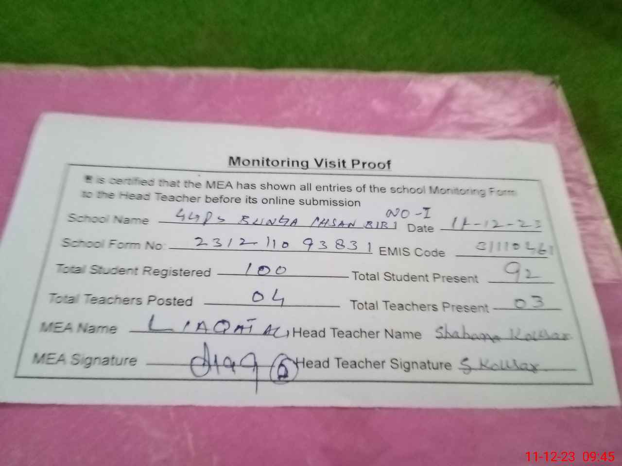 | Attendance Register | Head Teacher | MEA with School | Visit Proof |