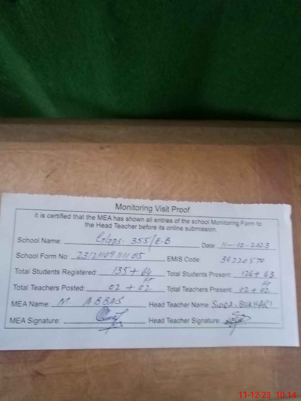 | Attendance Register | Head Teacher | MEA with School | Visit Proof |