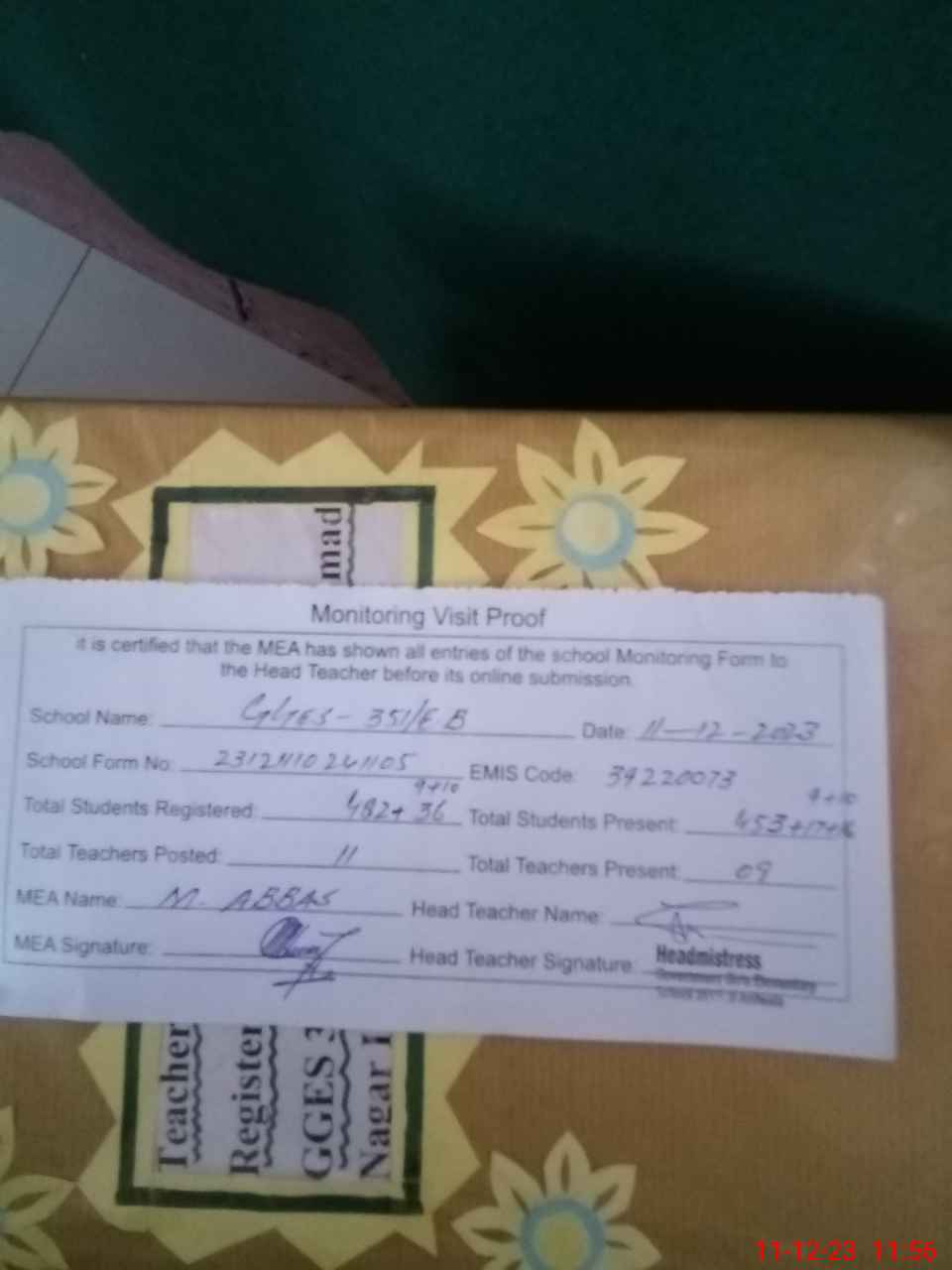 | Attendance Register | Head Teacher | MEA with School | Visit Proof |
