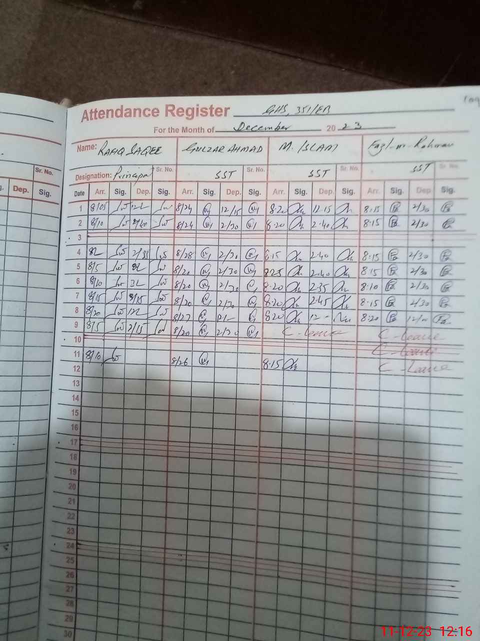 | CNIC | Full Name | Designation | R/C | Absence During Last Calender Month |
