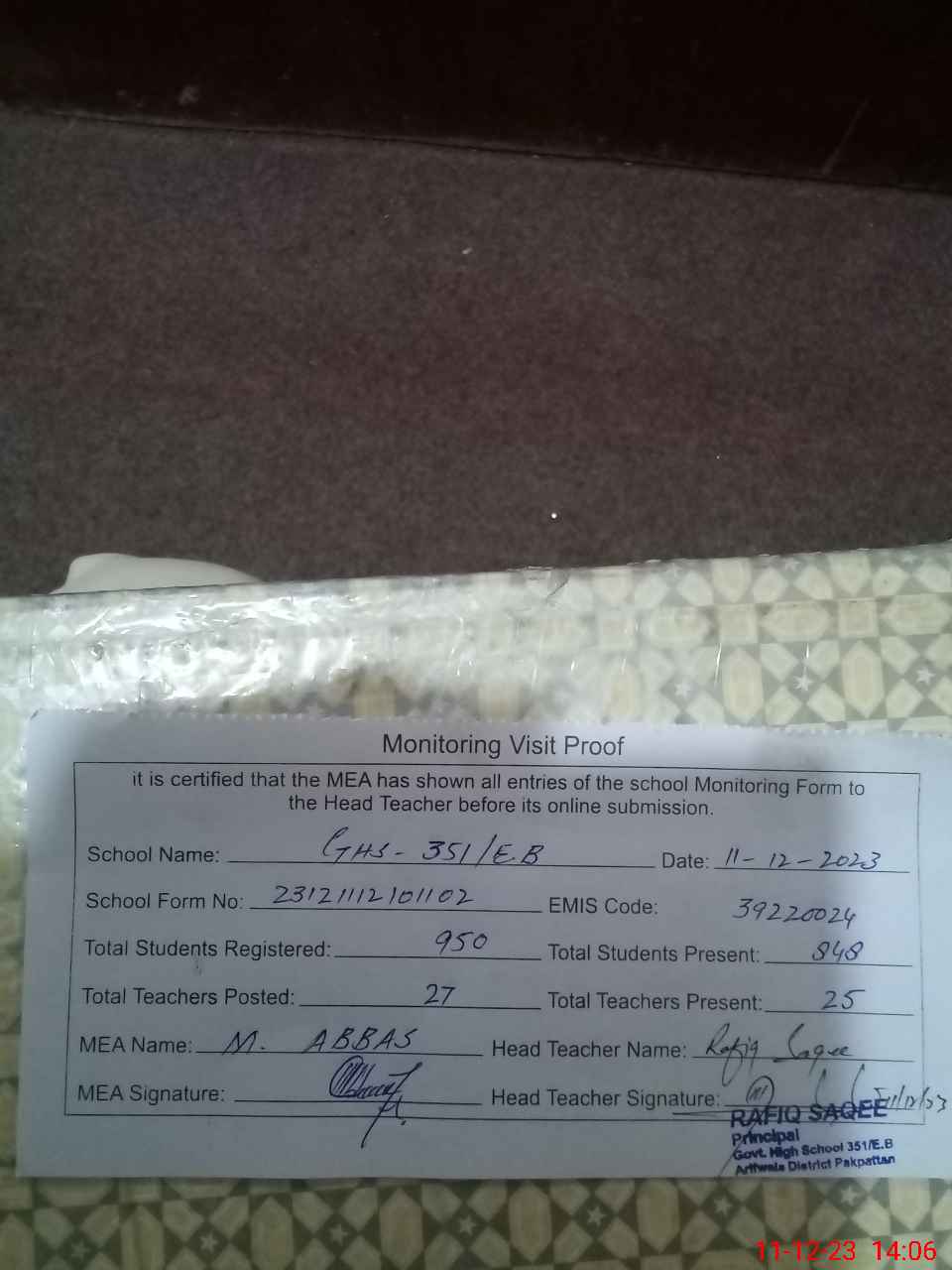 | EMIS Code: 39220024 | Name of School: GHS 351/EB ARIFWALA | |||