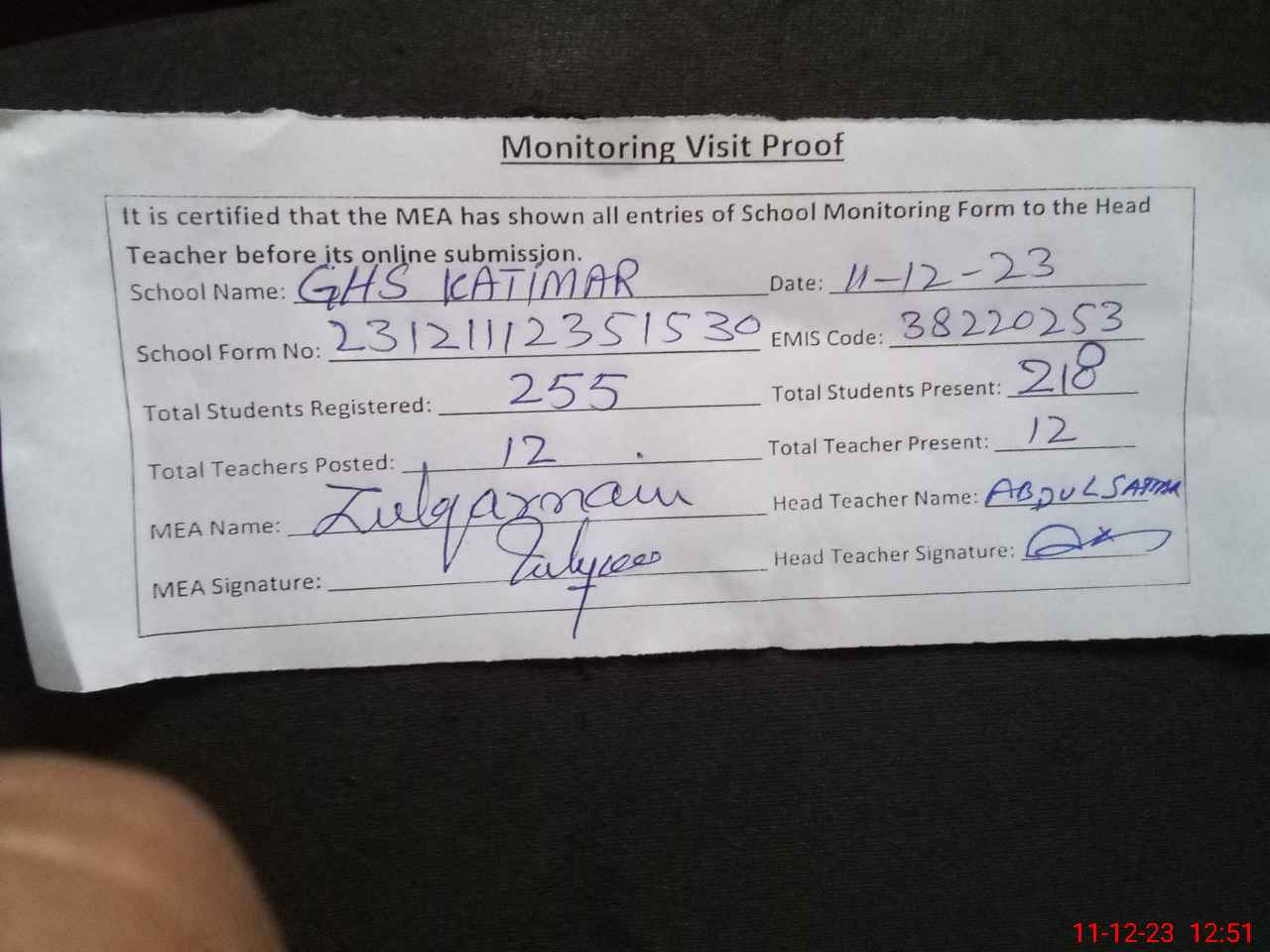 | Attendance Register | Head Teacher | MEA with School | Visit Proof |
