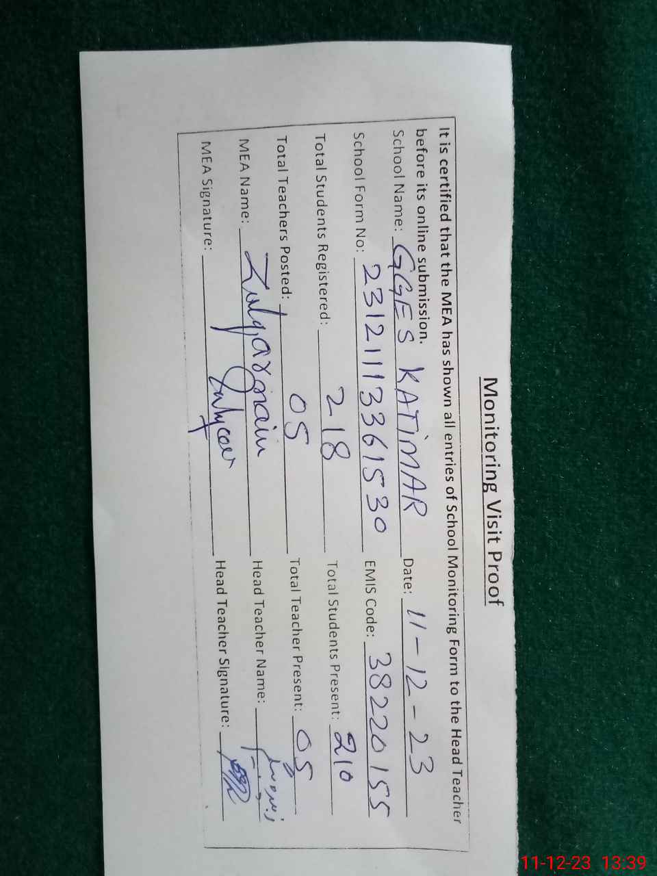 | Attendance Register | Head Teacher | MEA with School | Visit Proof |