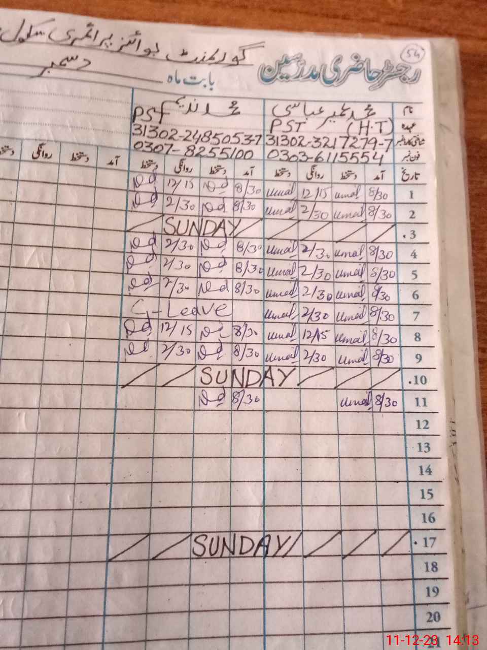 | CNIC | Full Name | Designation | R/C | Absence During Last Calender Month |