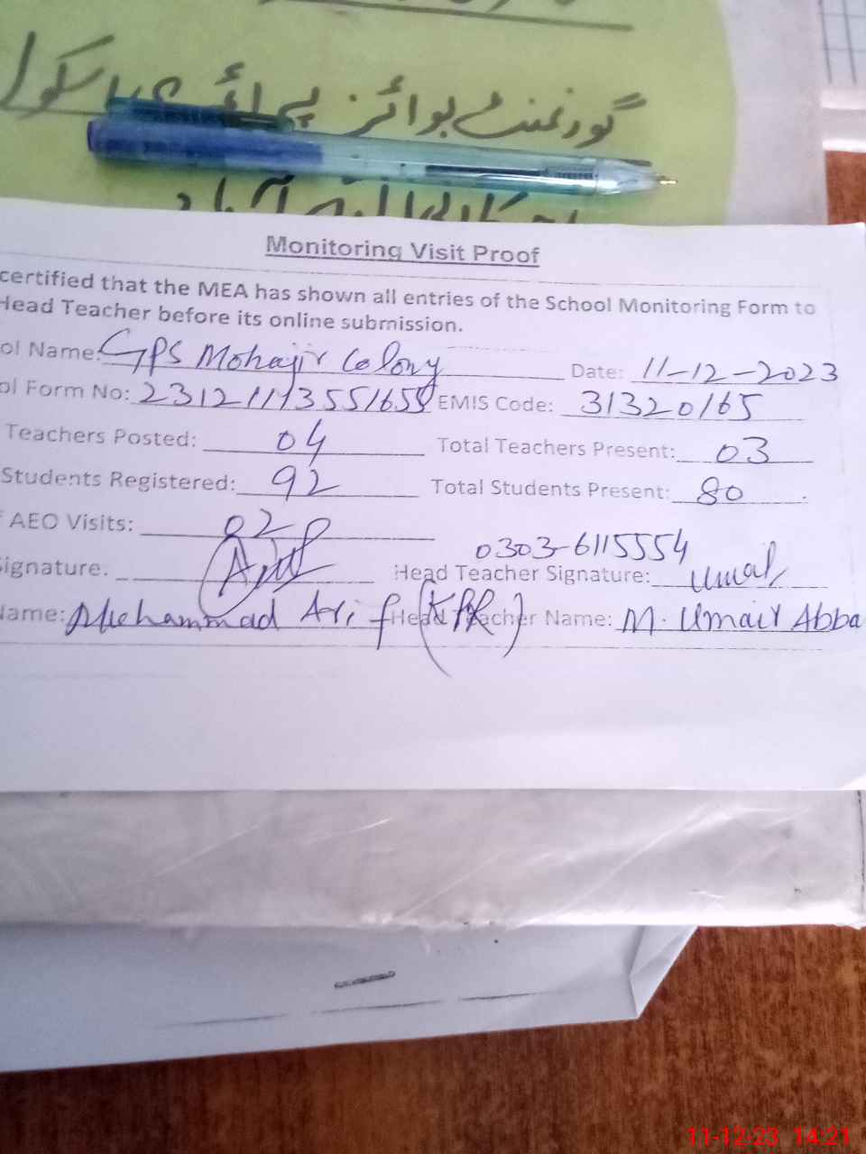 | Attendance Register | Head Teacher | MEA with School | Visit Proof |