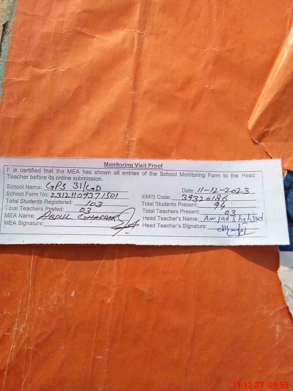 | EMIS Code: 39320186 | Name of School: GPS CHAK NO 31/G.D | |||