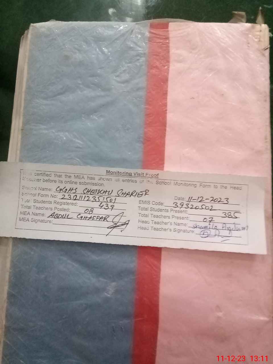 | Attendance Register | Head Teacher | MEA with School | Visit Proof |