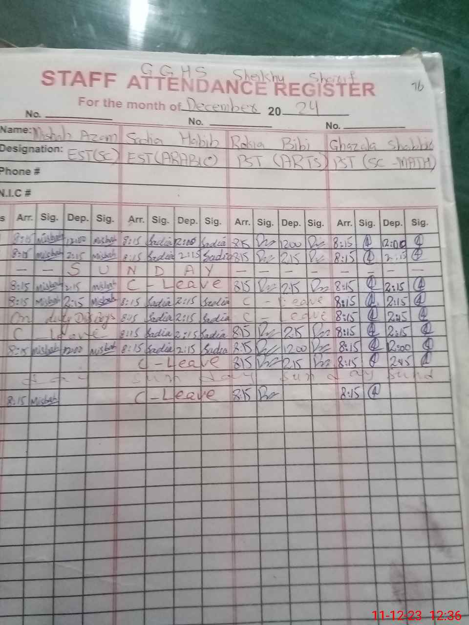 | CNIC | Full Name | Designation | R/C | Absence During Last Calender Month |