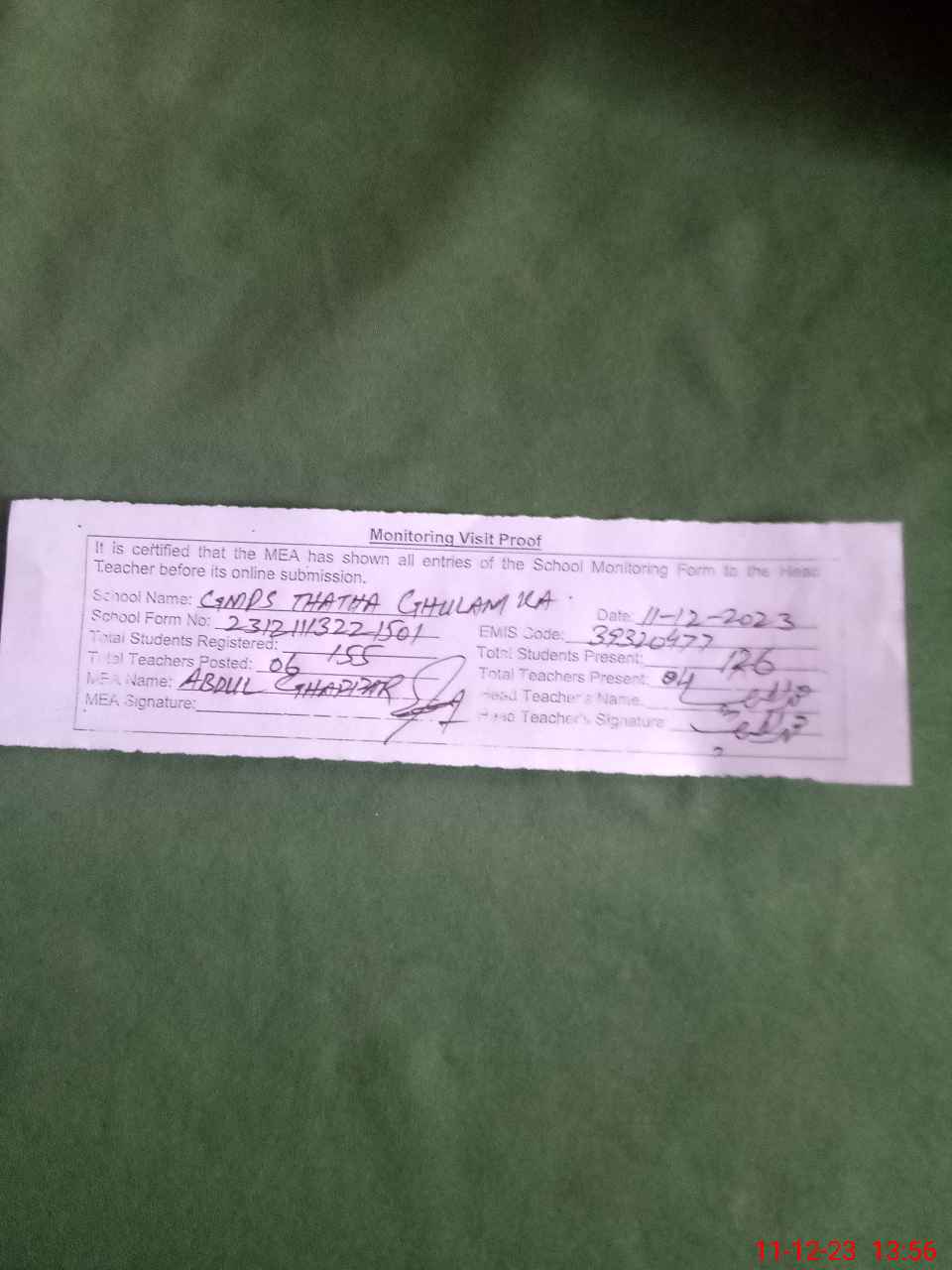 | EMIS Code: 39320477 | Name of School: GMPS THATHA GHULAM KAY | |||