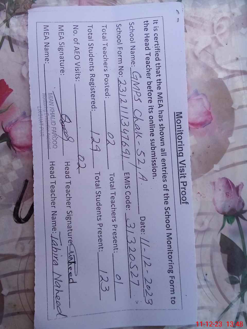 | EMIS Code: 31320527 | Name of School: GMPS CHAK NO.52/A | |||