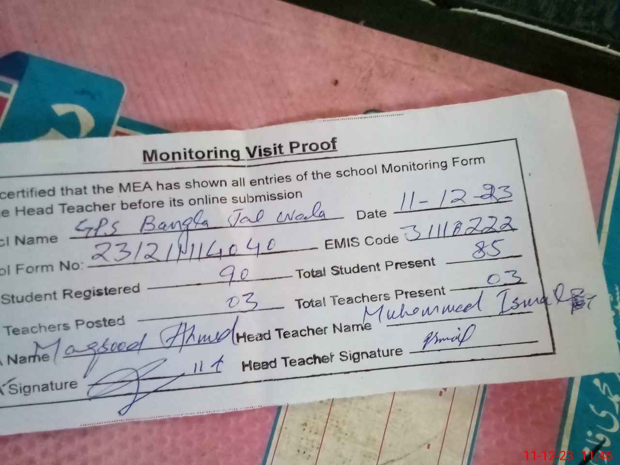 | EMIS Code: 31110222 | Name of School: GPS BANGLA JAL WALA | |||
