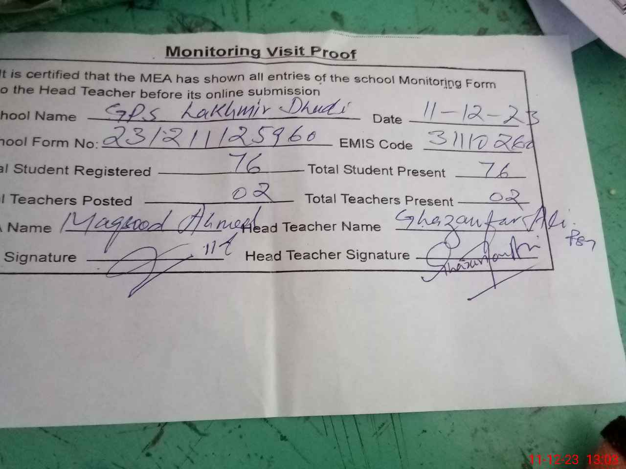 | EMIS Code: 31110260 | Name of School: GPS LAKHMIR DHUDI | |||