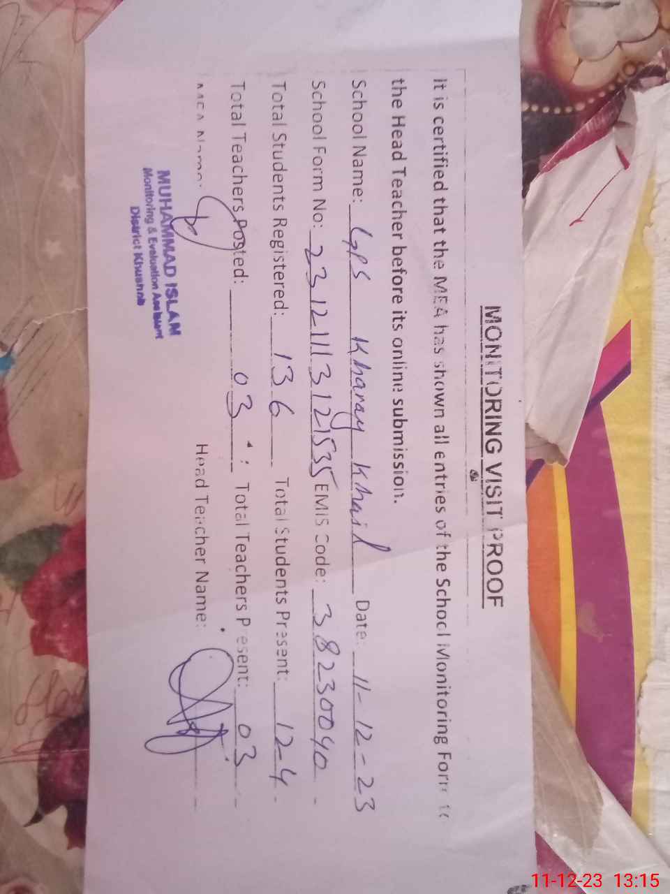 | EMIS Code: 38230040 | Name of School: GPS KHARAY KHAIL | |||