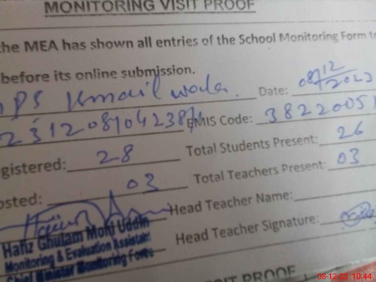 | Attendance Register | Head Teacher | MEA with School | Visit Proof |