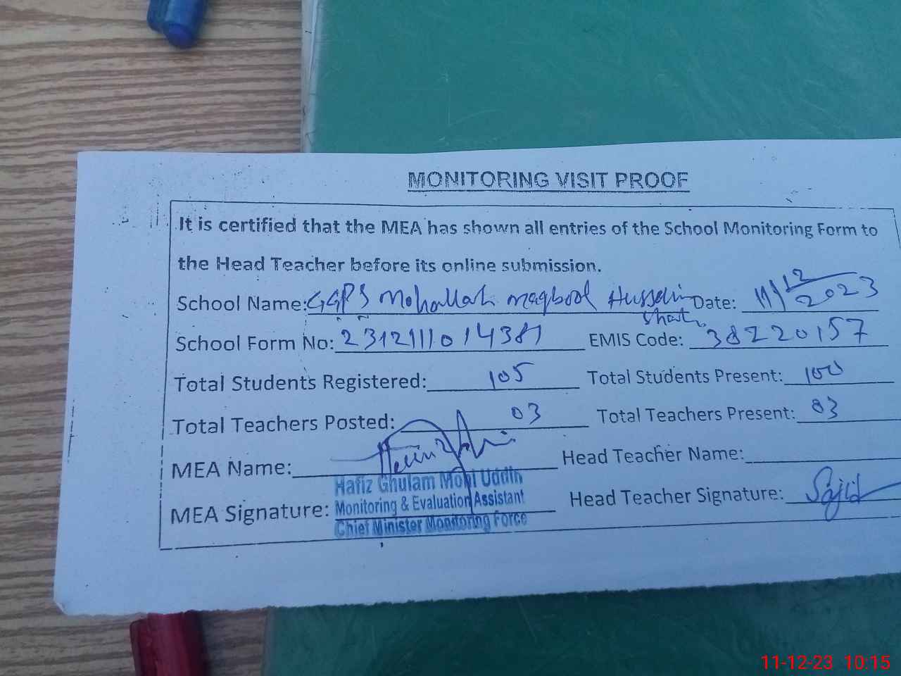 | Attendance Register | Head Teacher | MEA with School | Visit Proof |