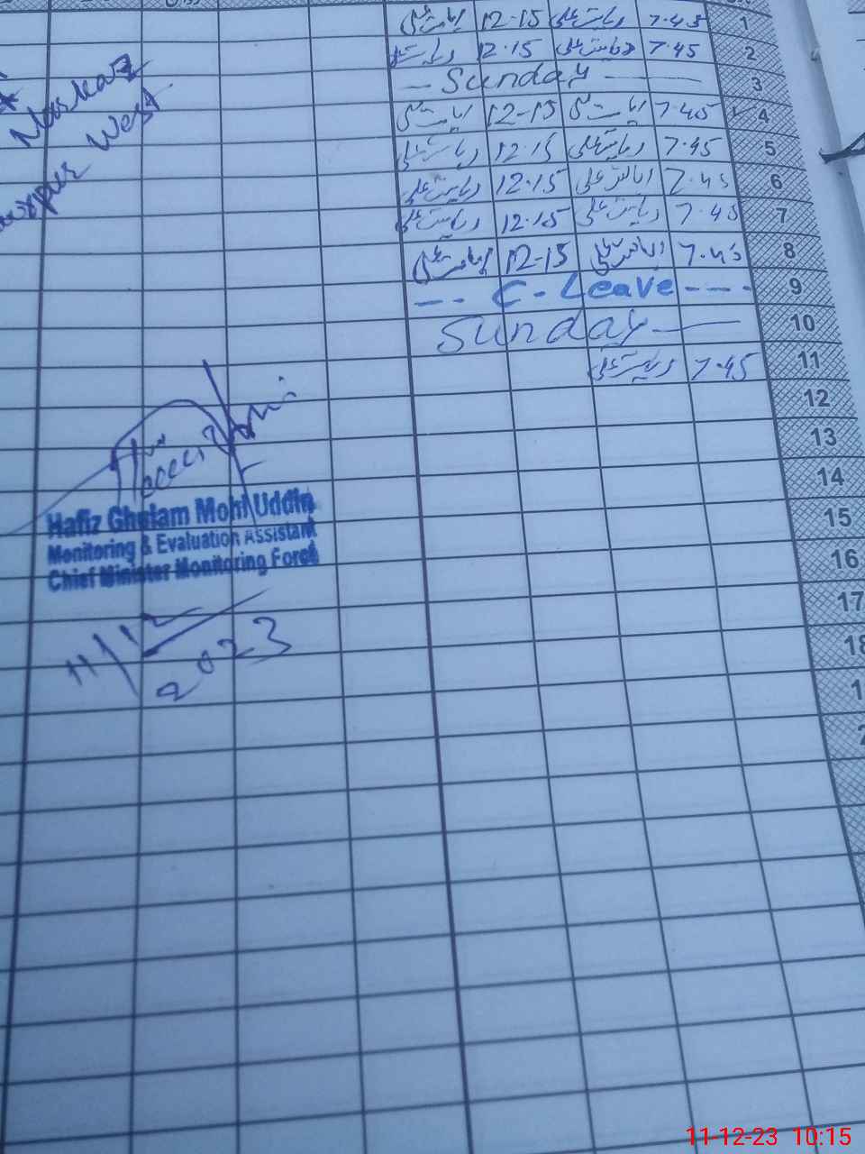 | CNIC | Full Name | Designation | R/C | Absence During Last Calender Month |