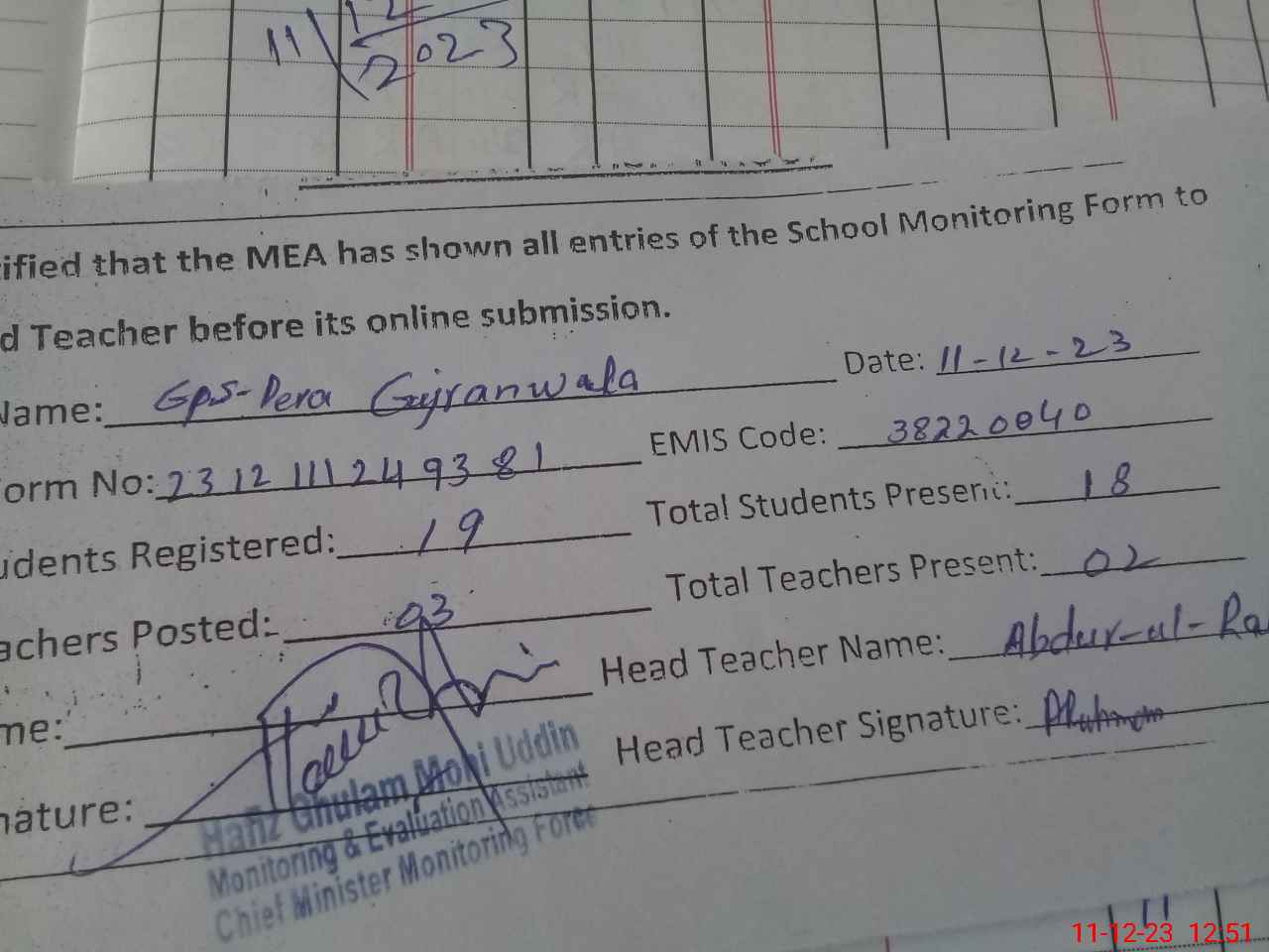 | EMIS Code: 38220040 | Name of School: GPS DERA GUJRAN WALA | |||