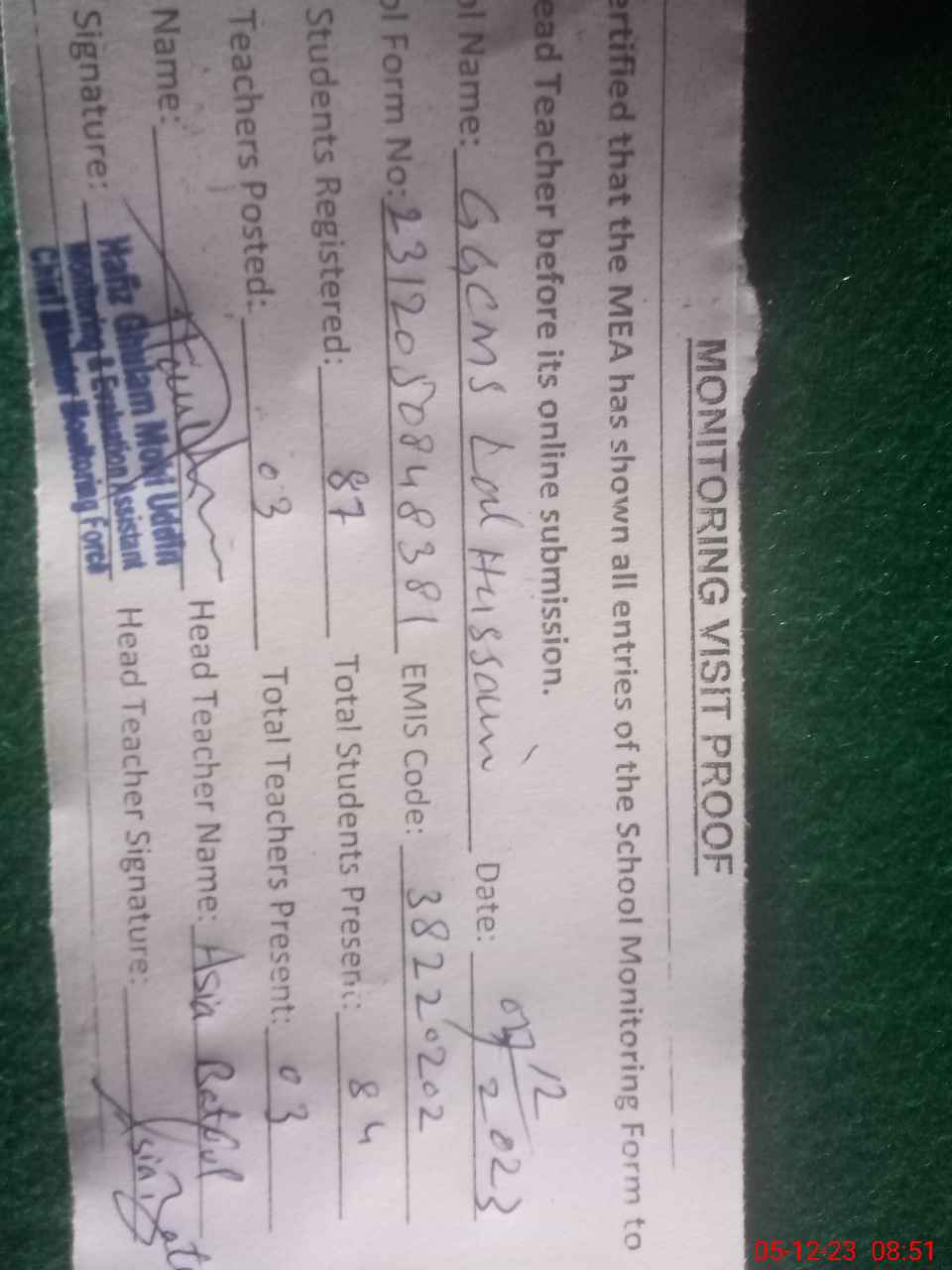 | Attendance Register | Head Teacher | MEA with School | Visit Proof |
