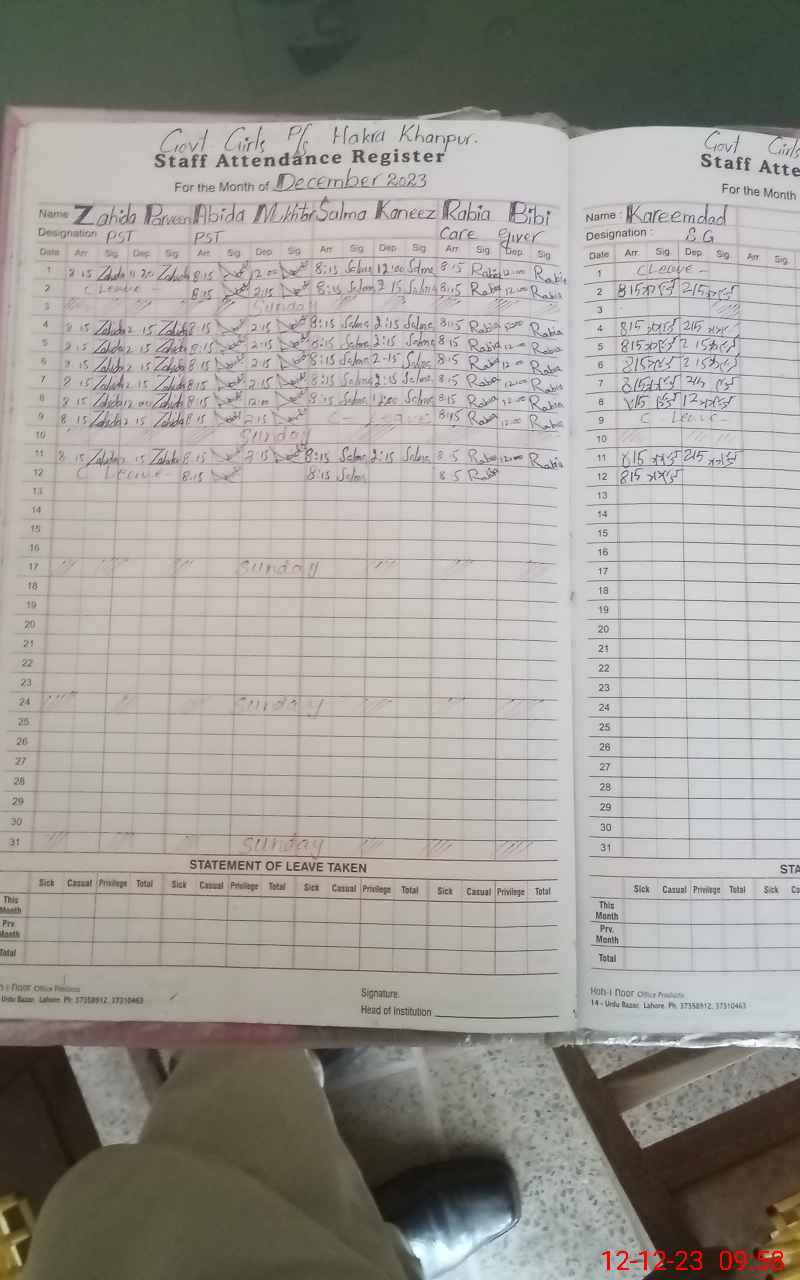| CNIC | Full Name | Designation | R/C | Absence During Last Calender Month |