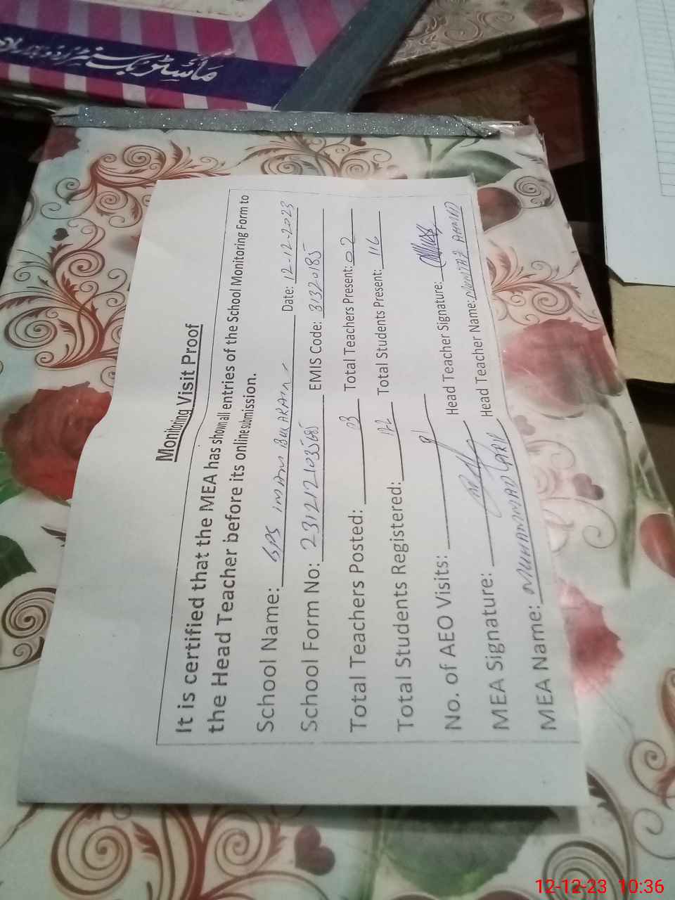 | Attendance Register | Head Teacher | MEA with School | Visit Proof |