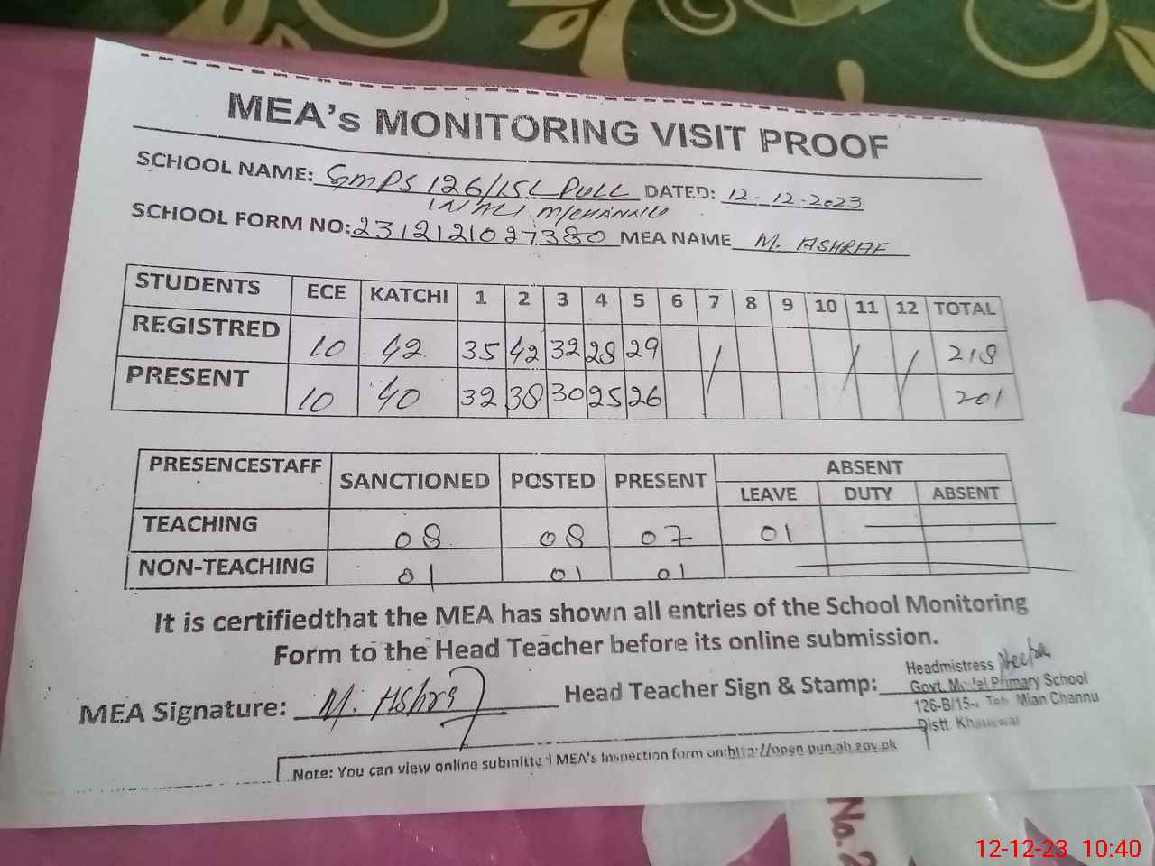 | EMIS Code: 36430284 | Name of School: GMPS 126/15-L PULL WALI, MIAN CHANNU | |||