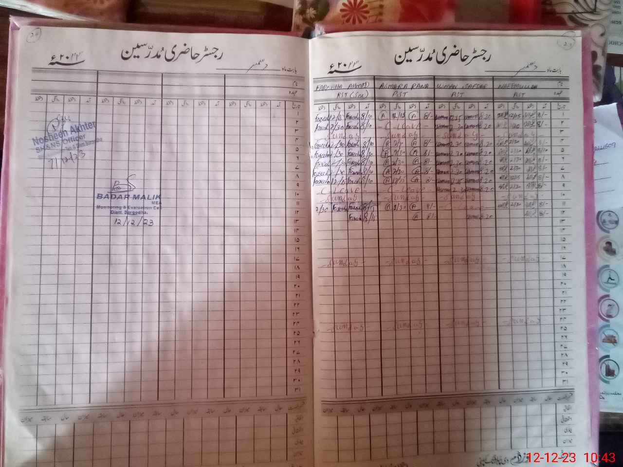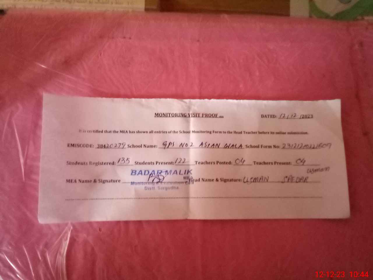 | Attendance Register | Head Teacher | MEA with School | Visit Proof |