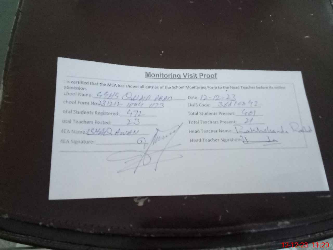 | EMIS Code: 36610042 | Name of School: GGHS QUAID ABAD | |||