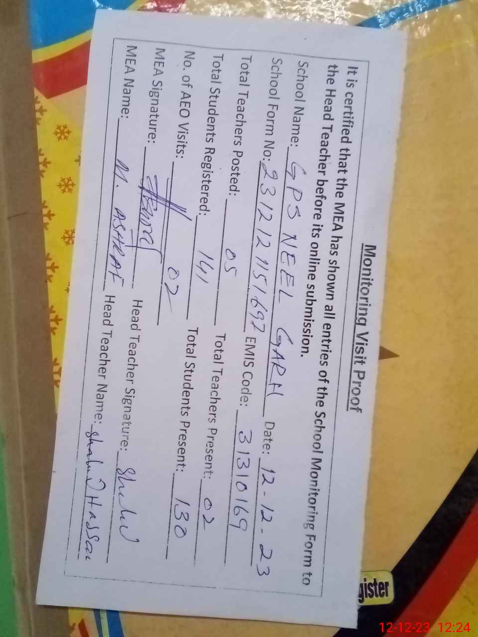 | EMIS Code: 31310167 | Name of School: GPS NEEL GARH | |||
