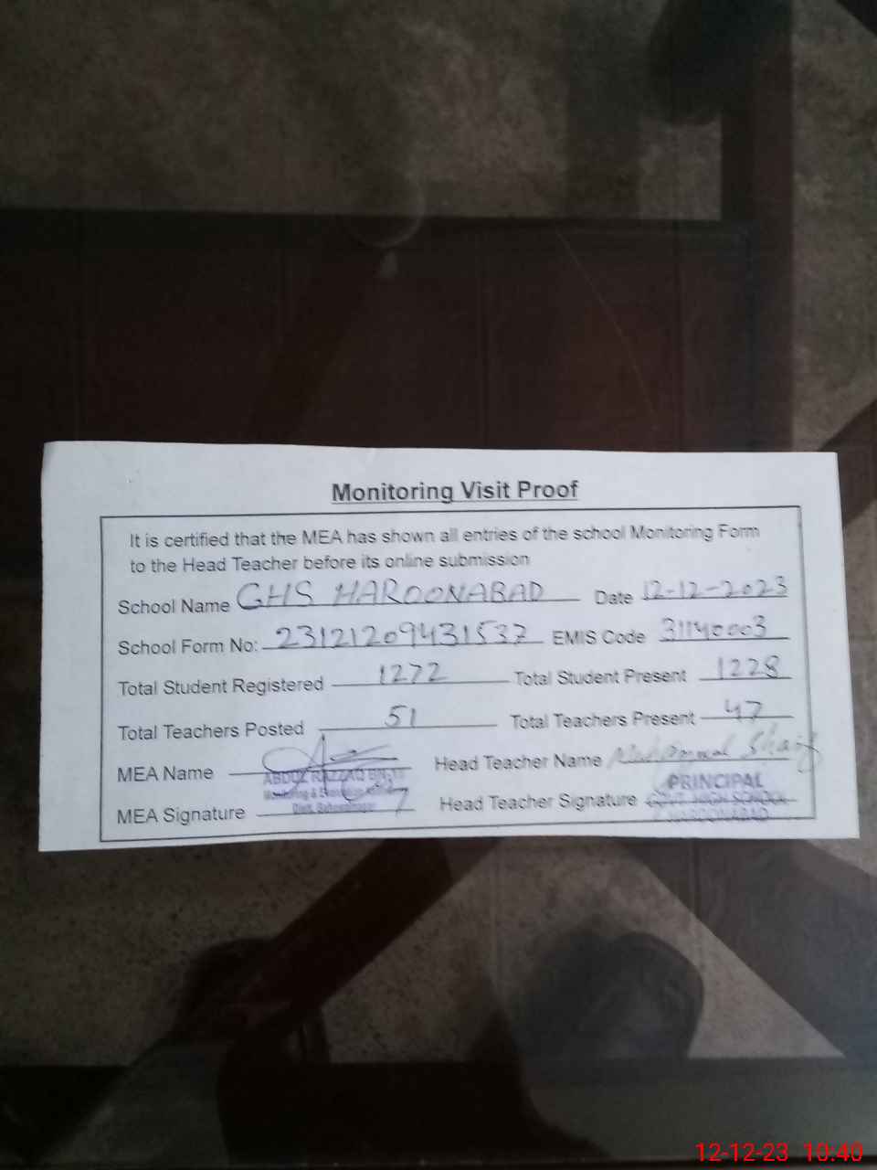 | Attendance Register | Head Teacher | MEA with School | Visit Proof |