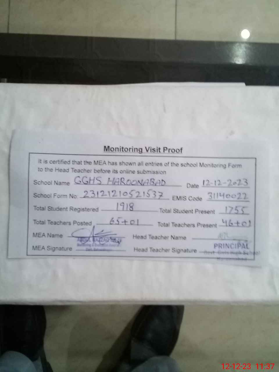 | Attendance Register | Head Teacher | MEA with School | Visit Proof |