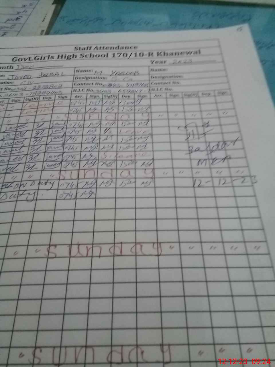 | CNIC | Full Name | Designation | R/C | Absence During Last Calender Month |