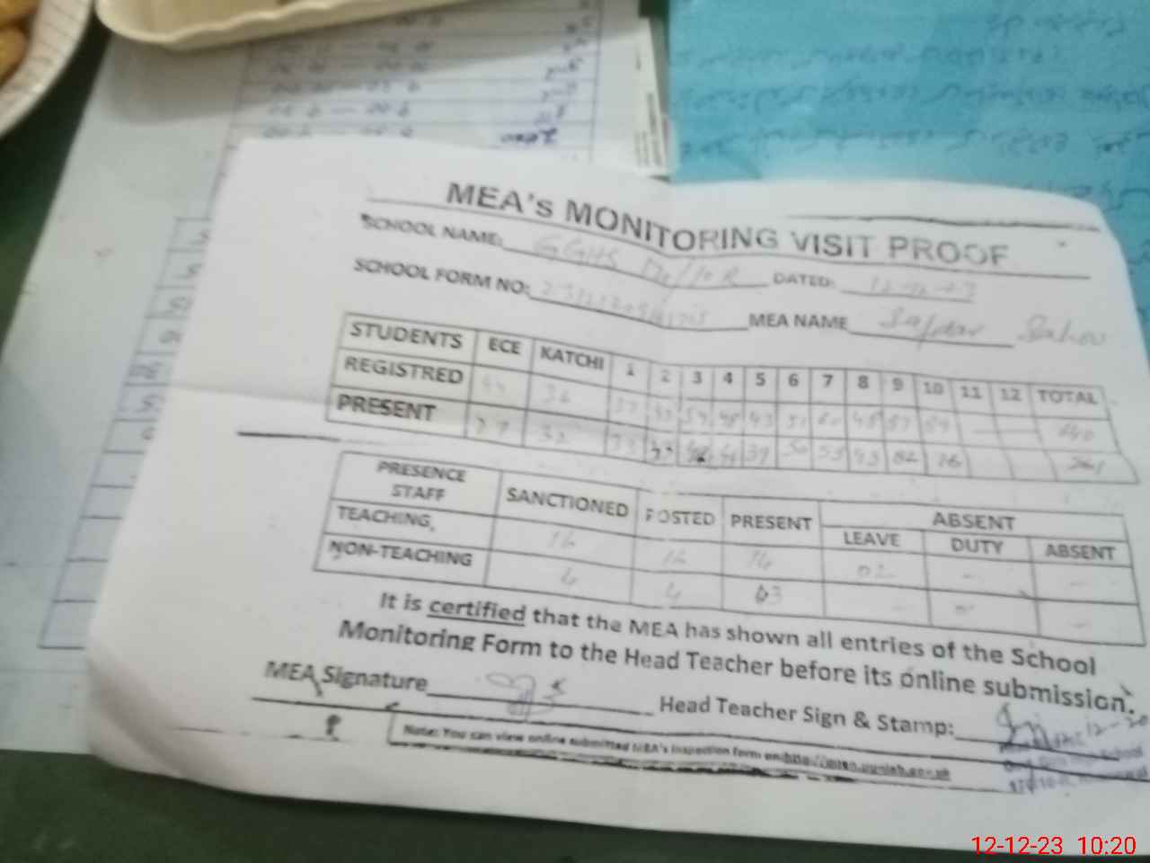 | Attendance Register | Head Teacher | MEA with School | Visit Proof |