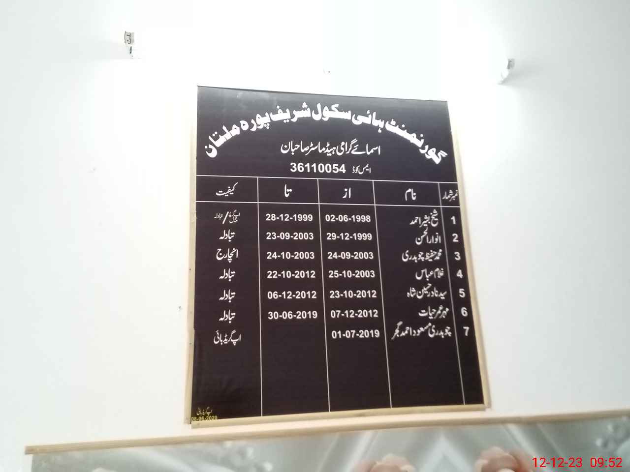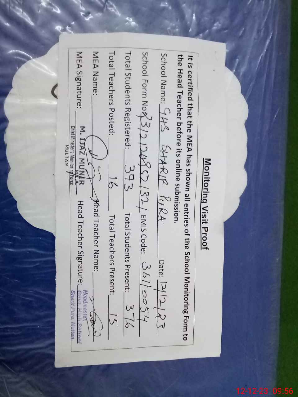 | EMIS Code: 36110054 | Name of School: GHS SHARIF PURA BAIWA COLONY MULTAN | |||