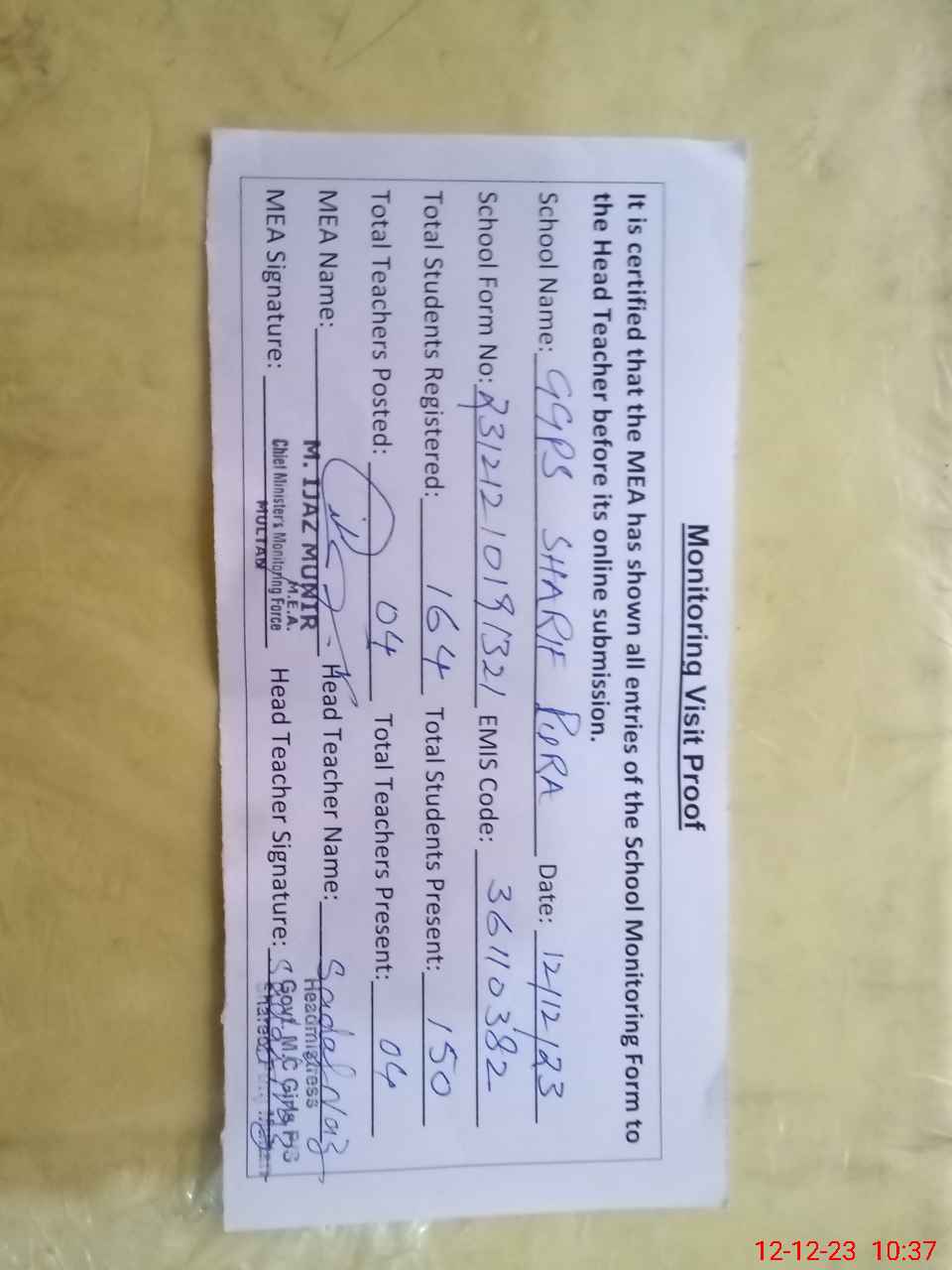 | EMIS Code: 36110382 | Name of School: GGPS MC SHAREEF PURA | |||