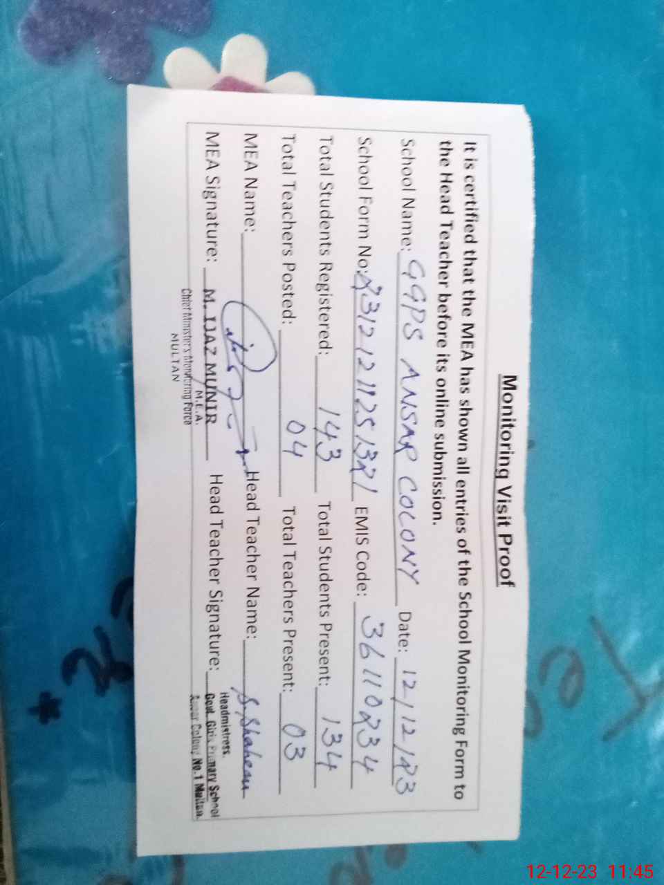 | EMIS Code: 36110234 | Name of School: GGPS ANSAR COLONY NO.1 MULTAN | |||