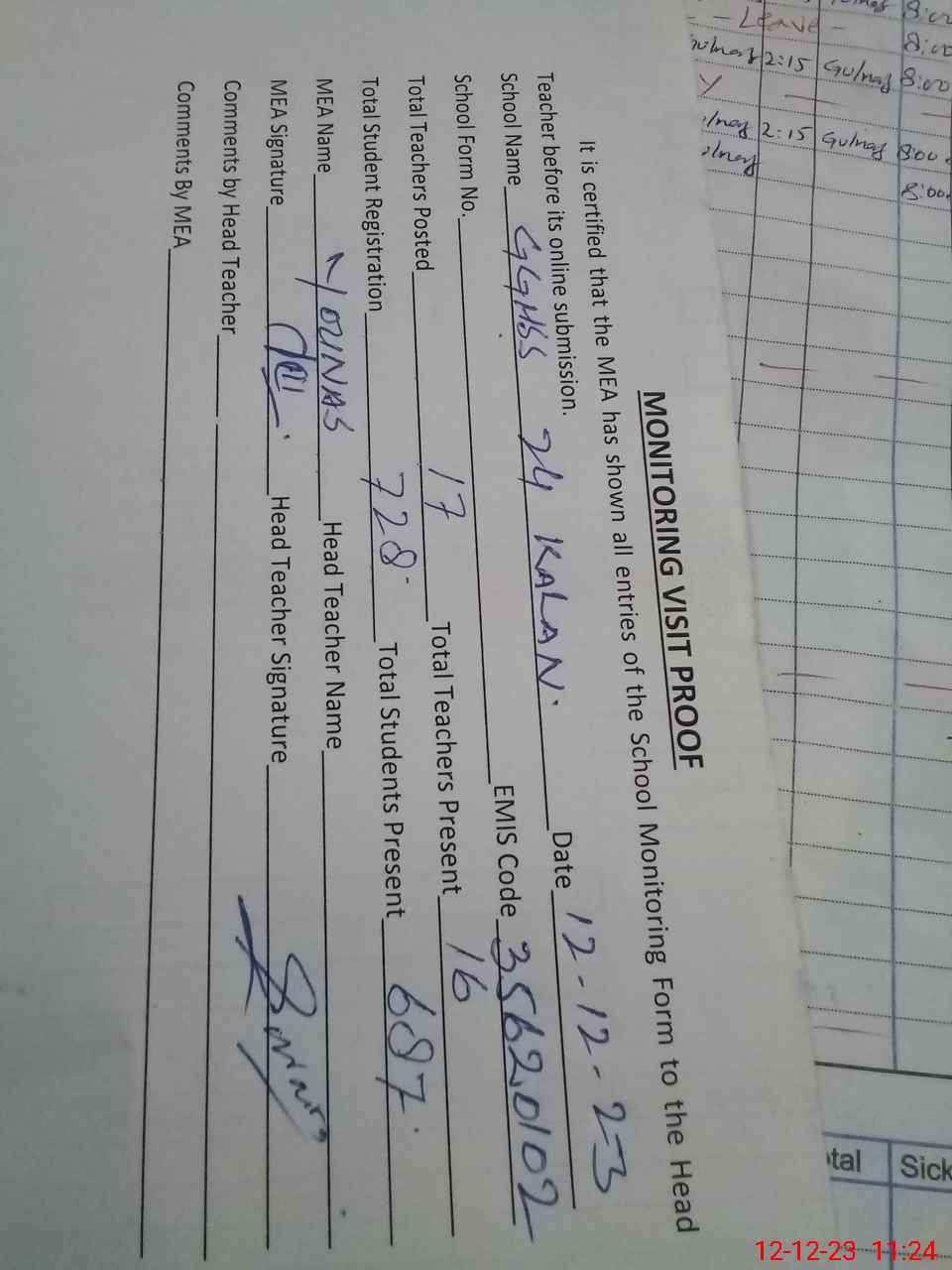 | Attendance Register | Head Teacher | MEA with School | Visit Proof |