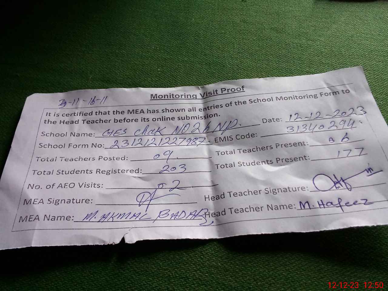 | Attendance Register | Head Teacher | MEA with School | Visit Proof |