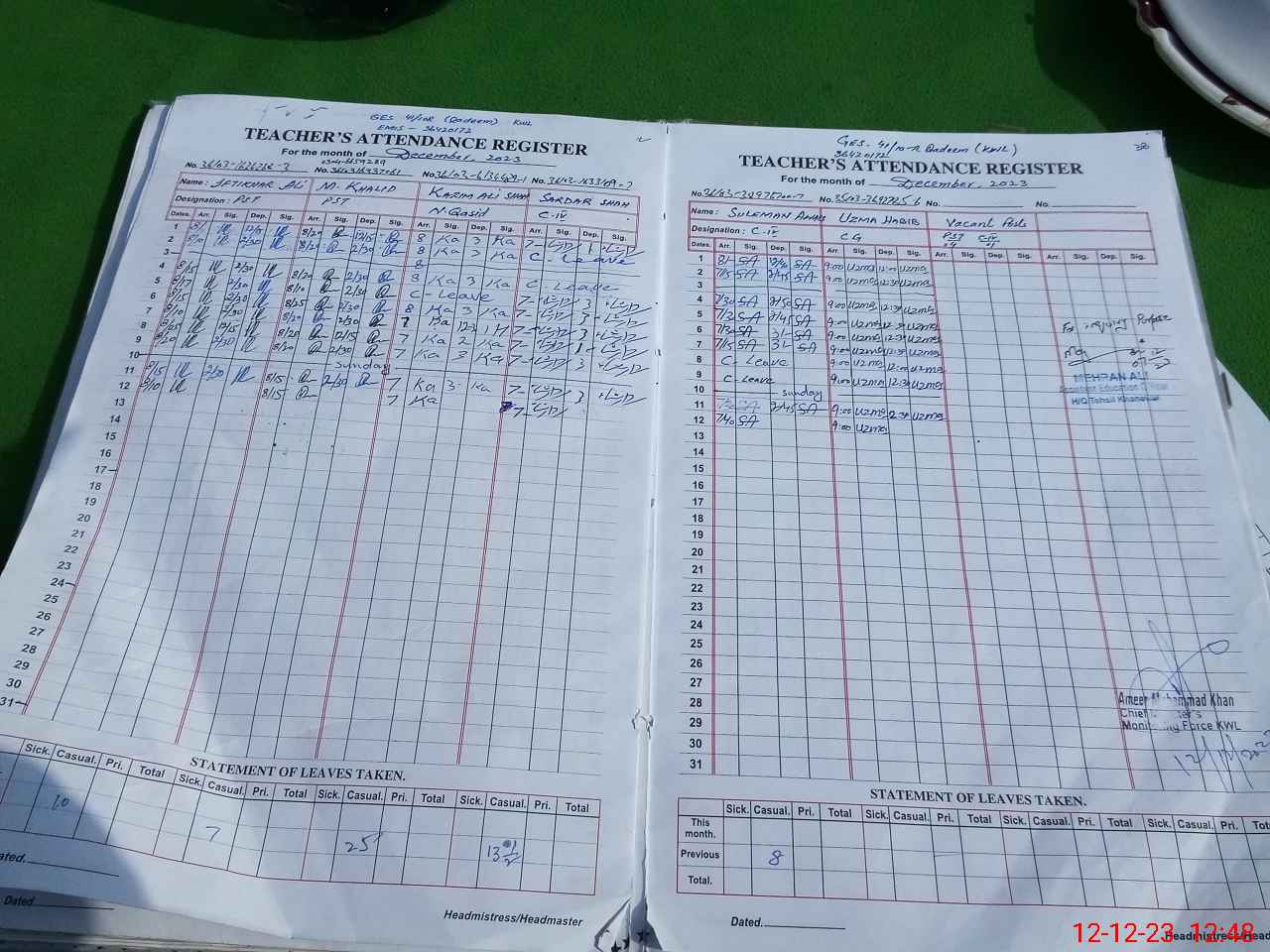 | CNIC | Full Name | Designation | R/C | Absence During Last Calender Month |