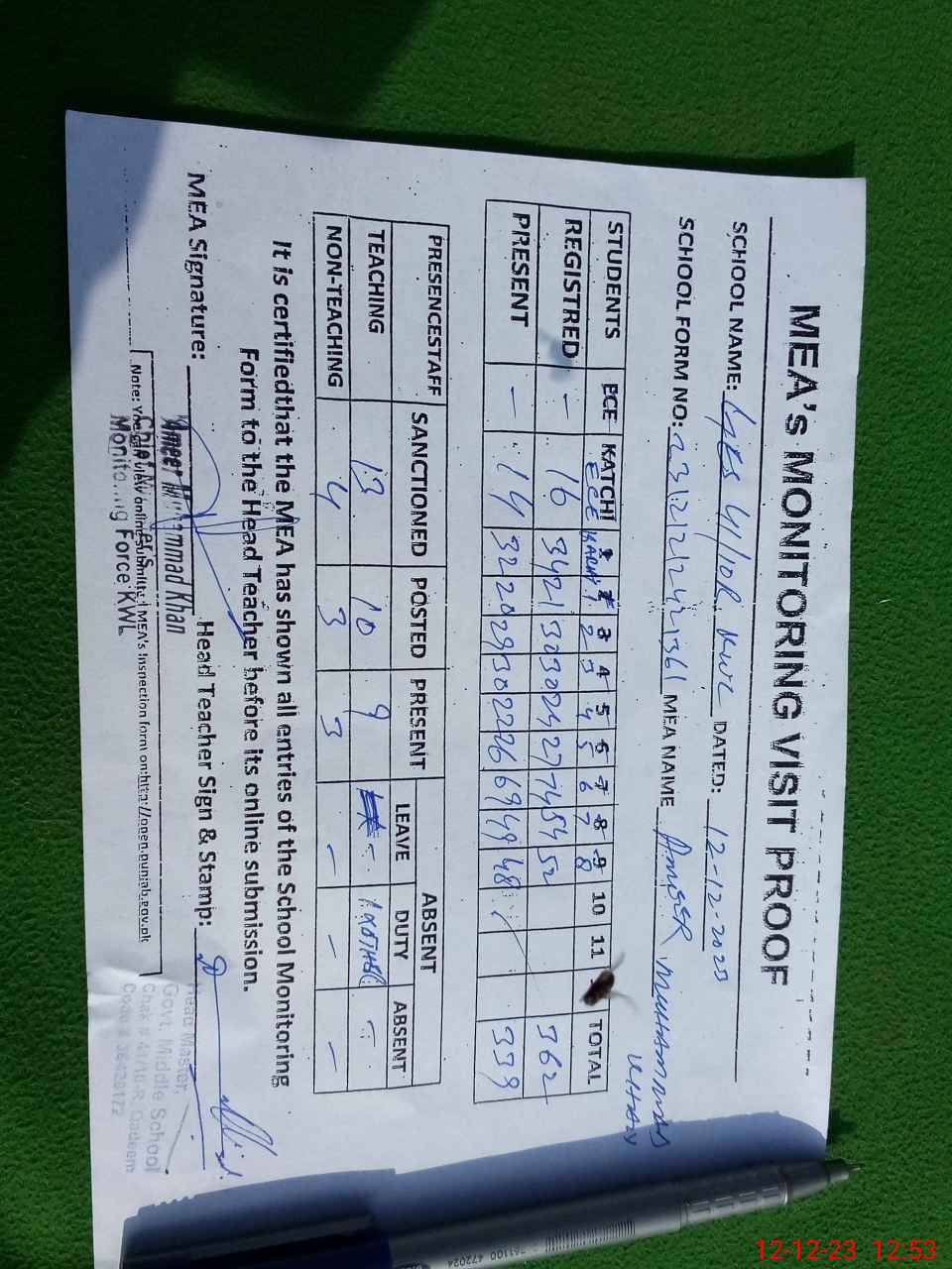 | Monitoring Date: 12-12-2023 | Start Time: 12-12-2023 11:37 AM | End Time: 12-12-2023 12:54 PM | Name of MEA: Am**** Mu**** Kh**** | |