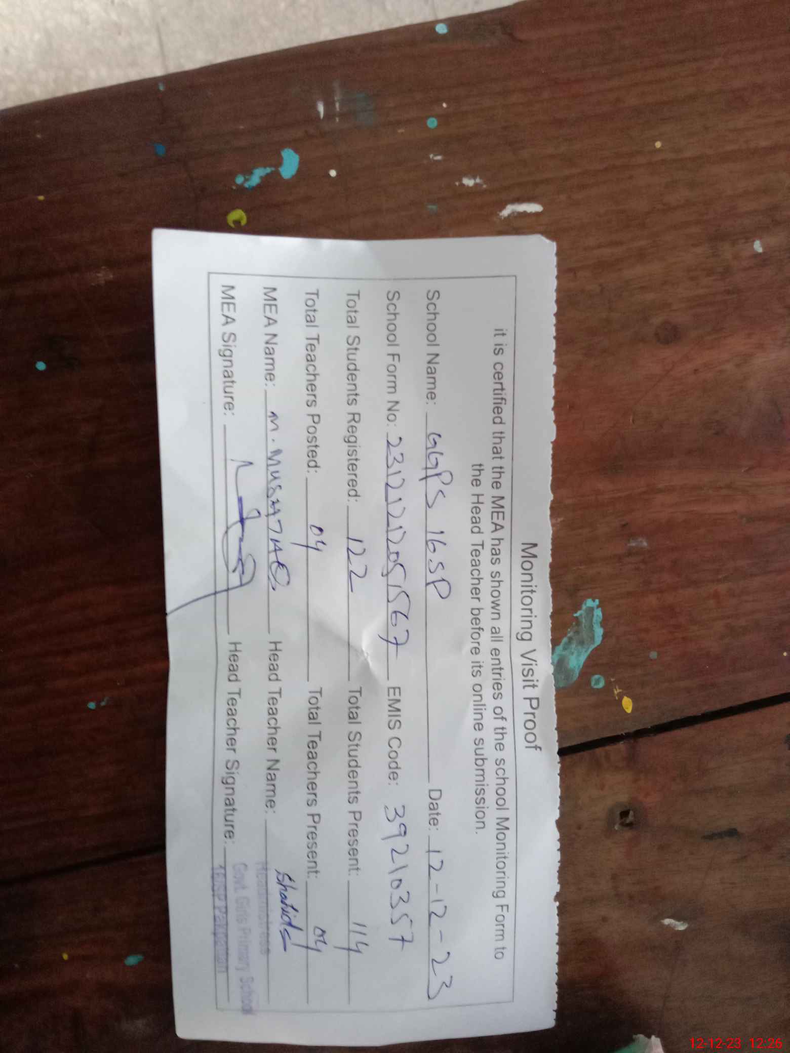 | Attendance Register | Head Teacher | MEA with School | Visit Proof |