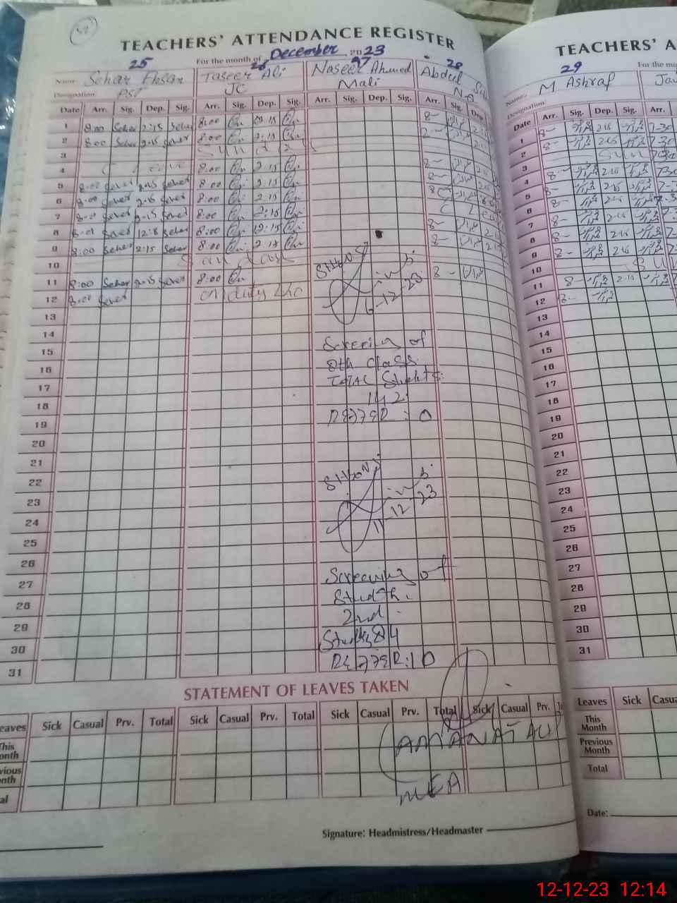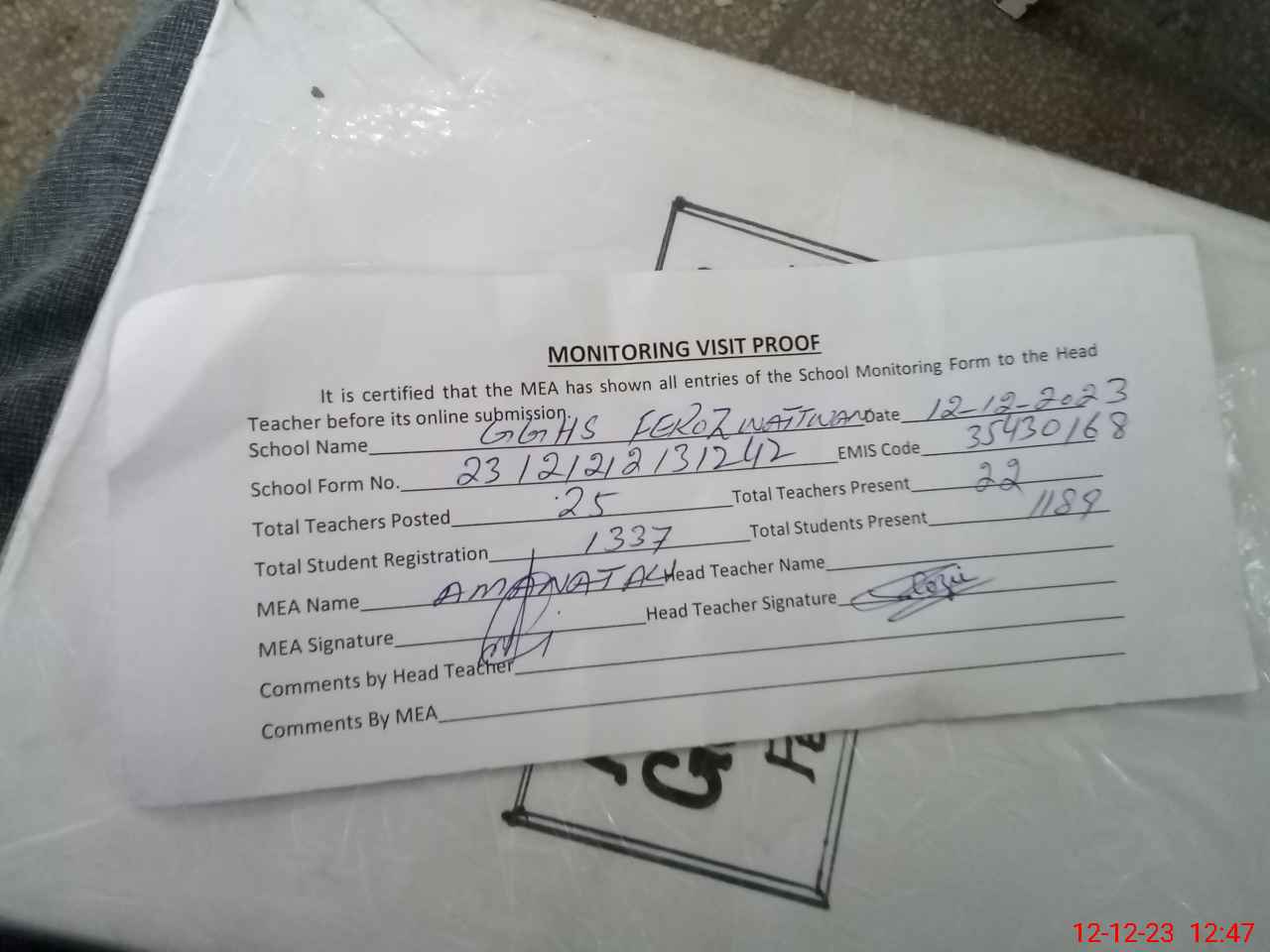 | Attendance Register | Head Teacher | MEA with School | Visit Proof |