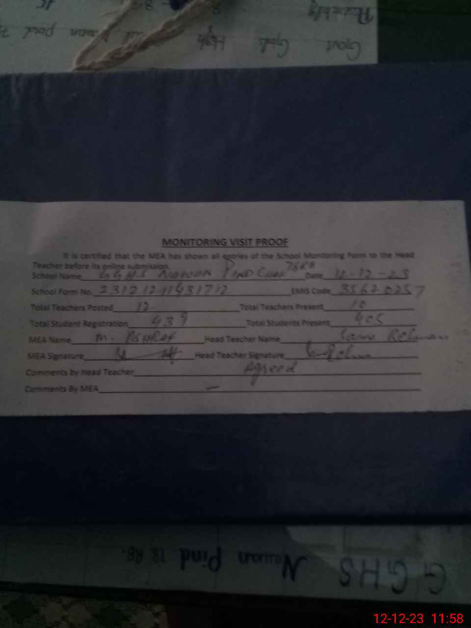 | Attendance Register | Head Teacher | MEA with School | Visit Proof |