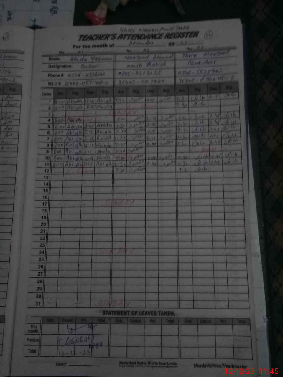 | CNIC | Full Name | Designation | R/C | Absence During Last Calender Month |