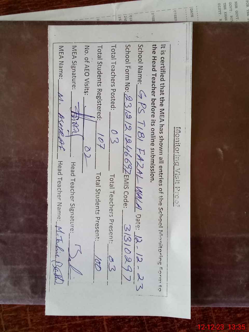| EMIS Code: 31310297 | Name of School: GPS TIBI FAZIAL WALA | |||