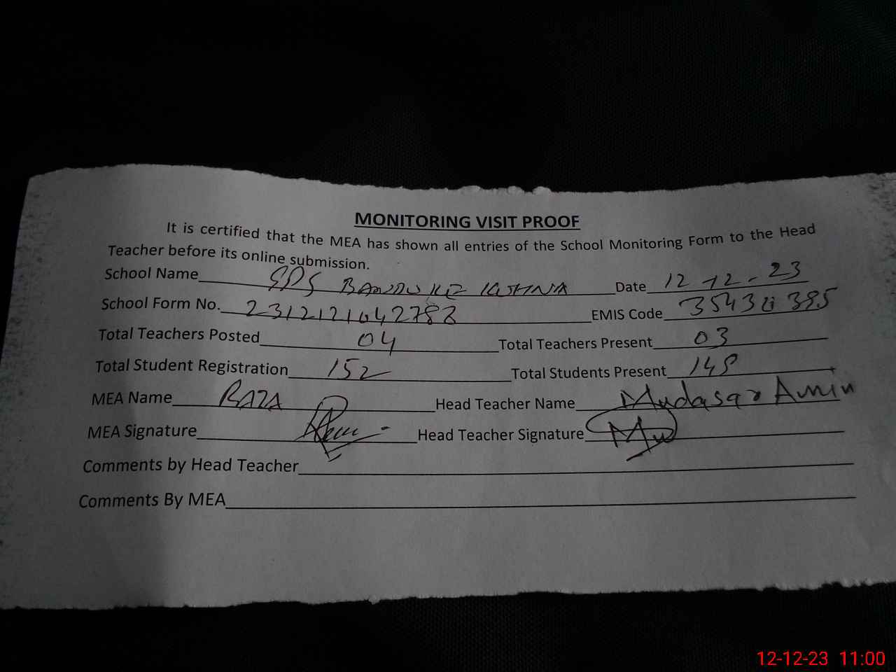 | Attendance Register | Head Teacher | MEA with School | Visit Proof |