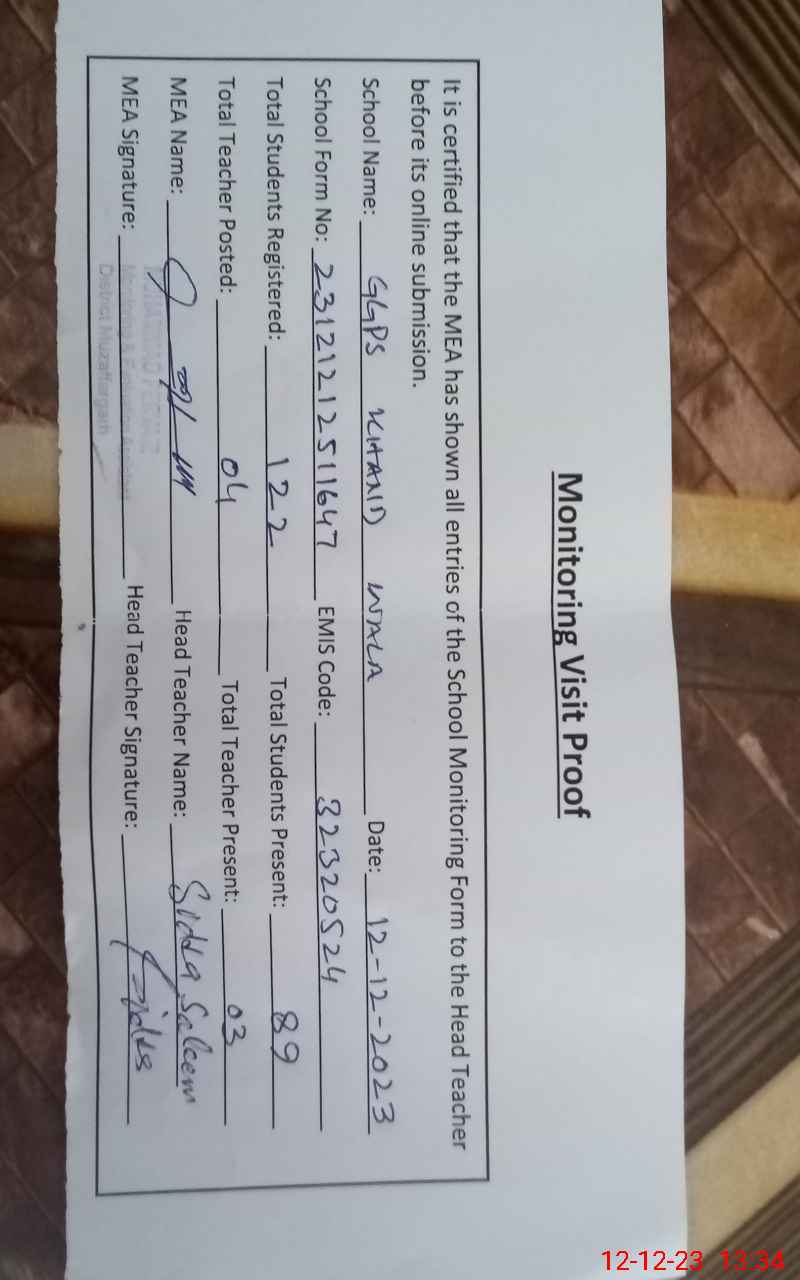 | Attendance Register | Head Teacher | MEA with School | Visit Proof |
