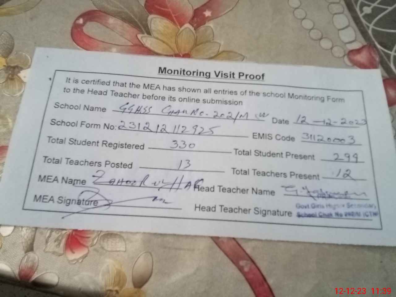 | EMIS Code: 31120003 | Name of School: GGHSS CHAK NO. 202 M (WEST | |||