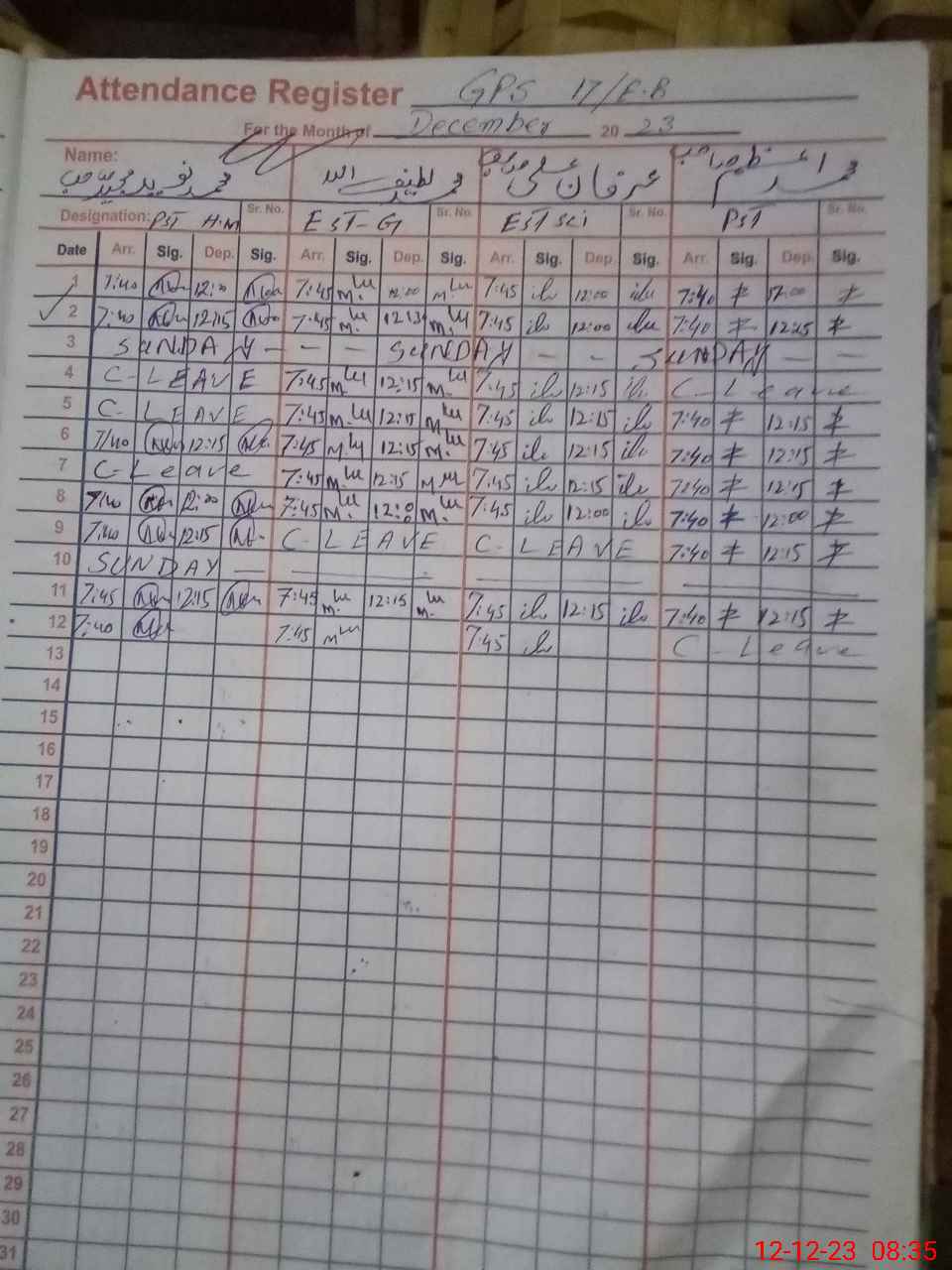 | CNIC | Full Name | Designation | R/C | Absence During Last Calender Month |